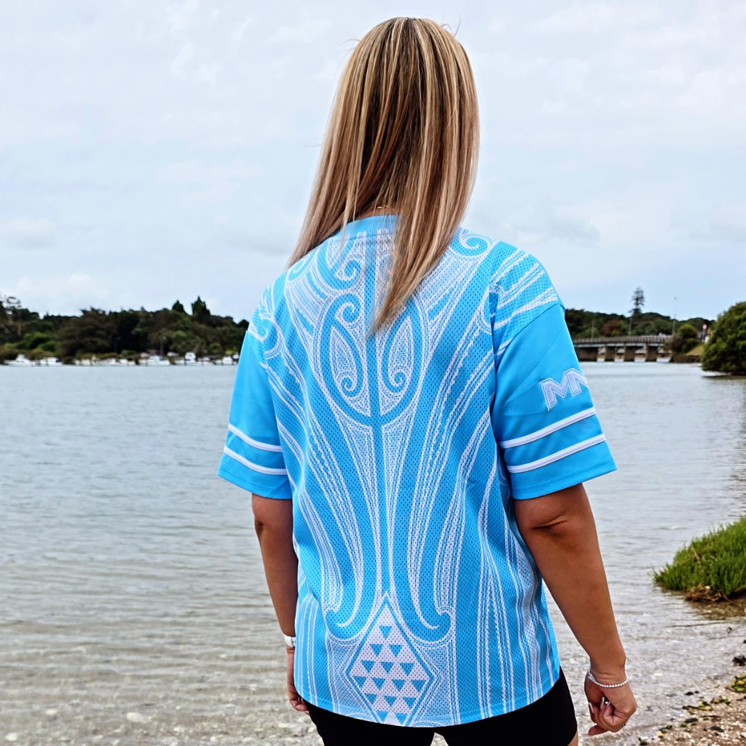 The Māori back design honours traditional artforms, symbolizing protection, balance, and identity - a reminder that true strength can be both powerful and composed. The icy baby blue base paired with crisp white accents reflects clarity, unity, and resilience, inspired by ocean tones and ancestral calm. The number 28 pays tribute to the 28th Māori Battalion - representing courage, loyalty, and excellence that continues to be carried forward.