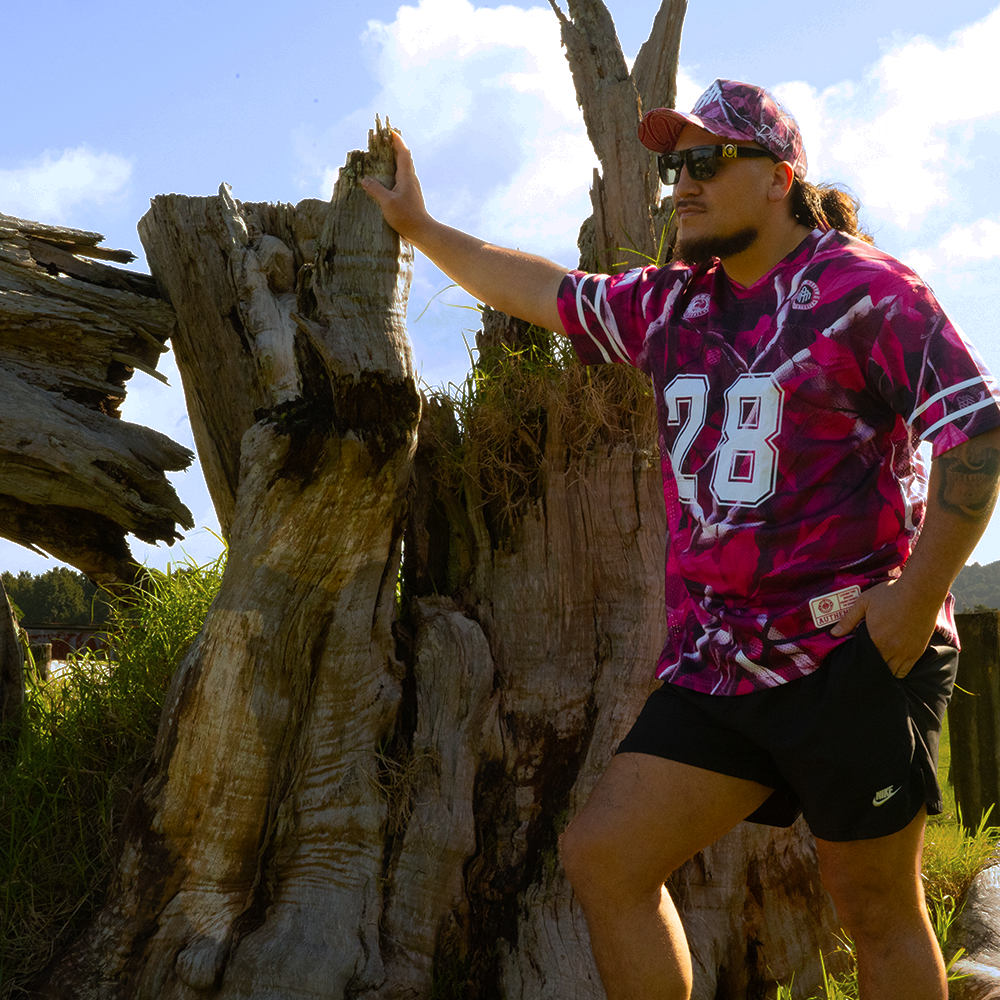 The Blush Forest Jersey delivers a modern take on camo with cultural pride at its core. Built with a heavy weight mesh body and back for performance and longevity, complemented by soft, comfortable shoulder panels. Finished with embroidered chest logos, tackle twill embroidered numbers, and an intricate Māori back design.