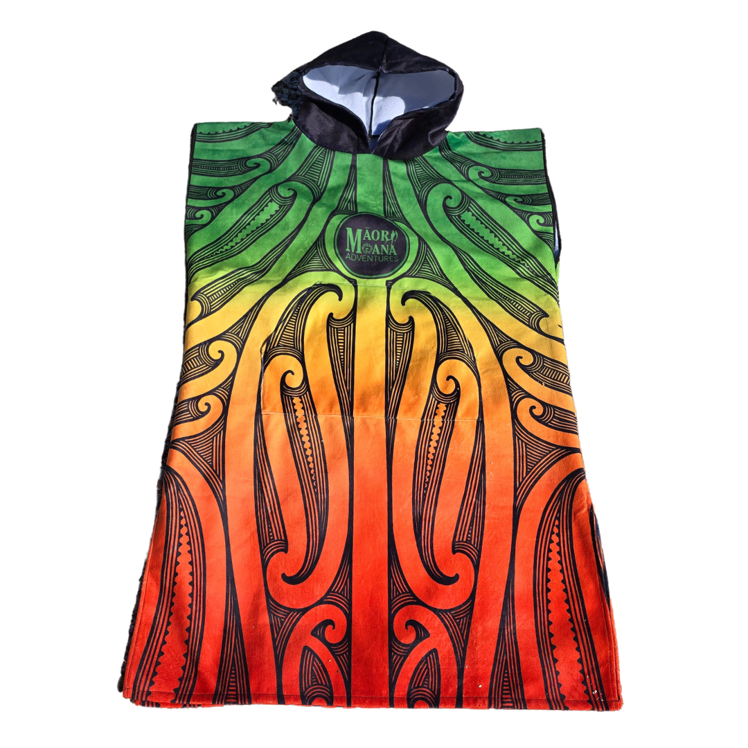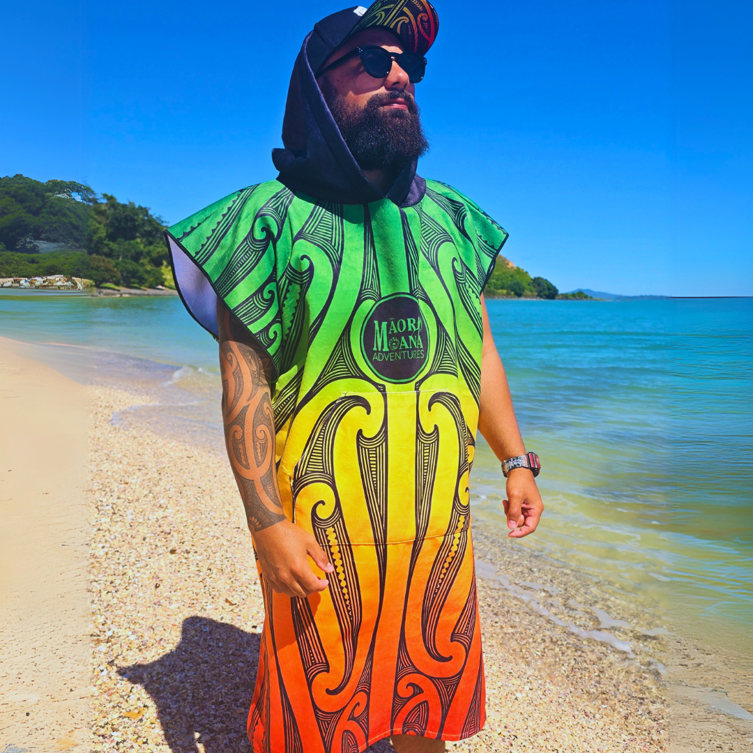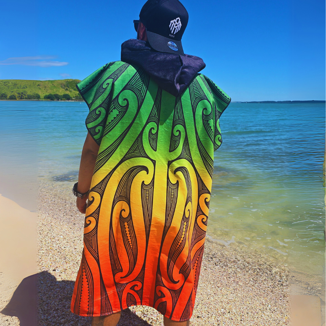 These towels are crafted to combine practicality with style. The outside material features luxuriously soft velour, showcasing vibrant colors and a unique Māori design that will never fade. On the inside, 100% absorbent terry cotton keeps you dry after a swim or surf. Whether you’re at the beach, by the pool, or exploring the outdoors, our Poncho Towels are your ultimate companion for comfort and cultural pride.